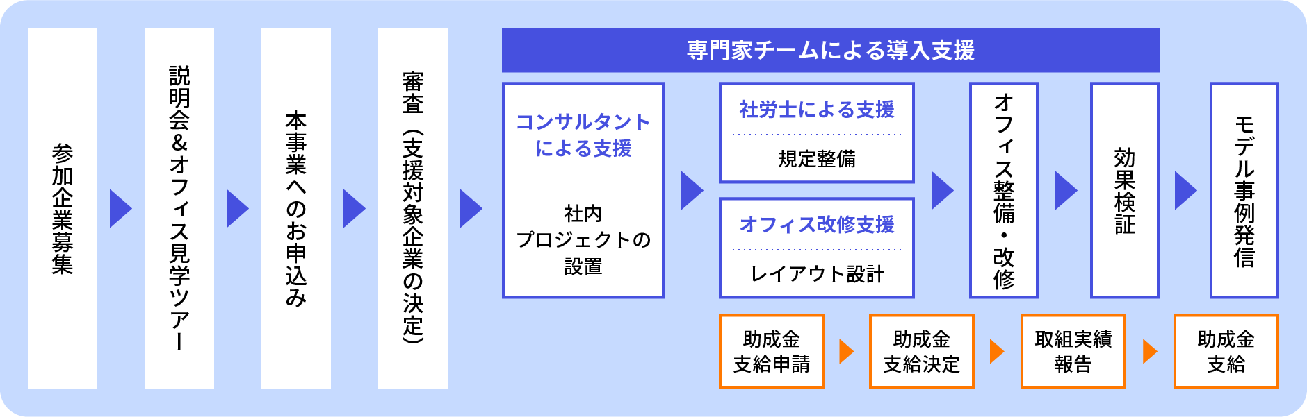 本事業では、ABWを取り入れたオフィスづくりを目指す企業と共に考え、計画を練り、実行まで伴走します。